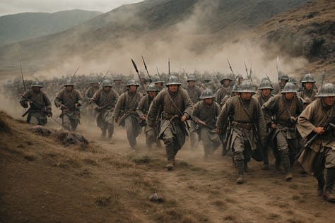 As the last of the eastern soldiers entered the trap, Darje gave the signal. A thunderous volley of gunfire erupted from the ridges, catching the enemy unawares. The initial barrage was devastating, felling many before confusion could turn to resistance. Then, with the ferocity of a mountain storm, Darje and his monks descended upon the beleaguered soldiers. The monks, like avatars of wrath, tore through the enemy ranks with a whirlwind of steel and fury.